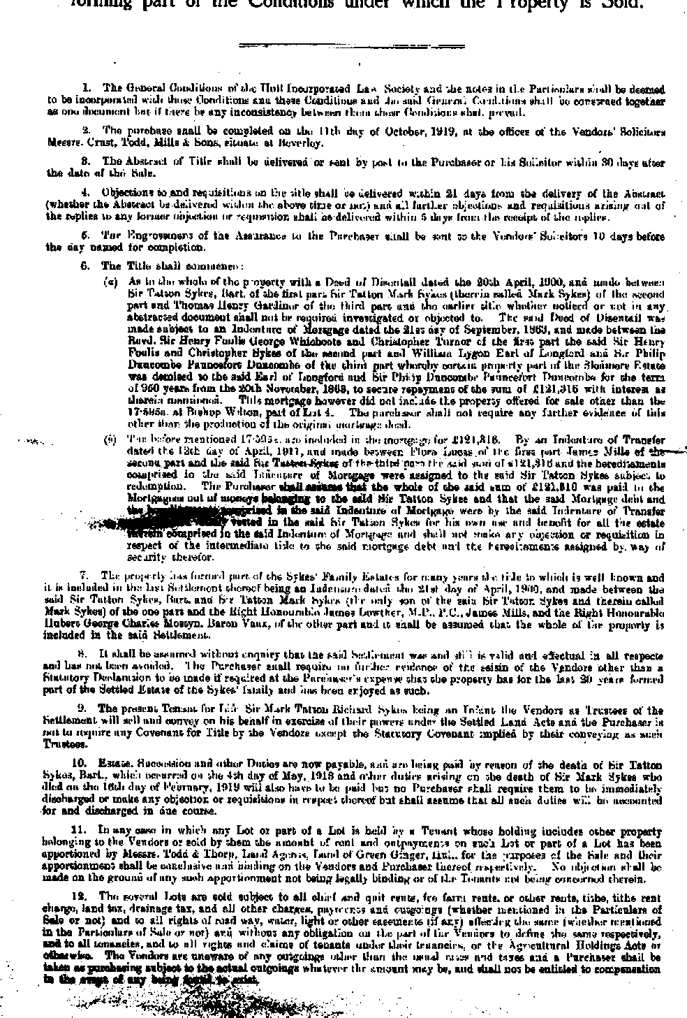 7. The property has formed part of the Sykes’ Family Estates for many years the title to which is well known and it is included in the last Settlement thereof being an Indenture dated the 21st day of April, 1900, and made between the said Sir Tatton Sykes, Bart. and Sir Tatton Mark Sykes (the only son of the said Sir Tatton Sykes and therein called Mark Sykes) of the one part and the Right Honourable James Lowther, M.P., P.C., James Mills, and the Right Honourable Hubert George Charles Mostyn, Baron Vaux, of the other part and it shall be assumed that the whole of the property is included in the said Settlement.