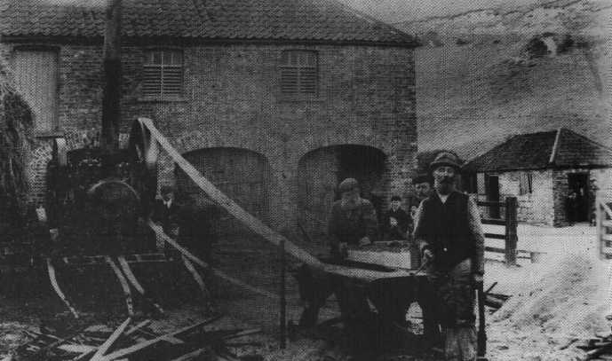 from around 1900 of woodcutting using a steam engine, Enoch Braithwaite can just be seen across the road at the blacksmith’s shop.